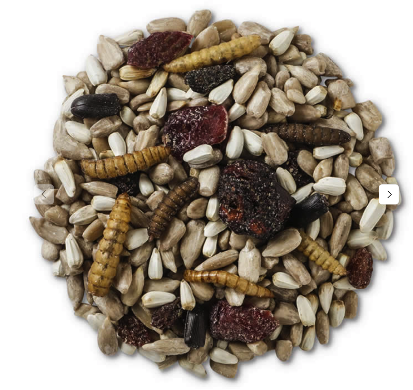 Dried mealworms are a protein-rich treat for your birds and provide naturally occurring organic nutrients. This blend of sunflower hearts, tree nuts, peanuts, raisins, cranberries, and dried mealworms are best served in hopper or platform feeders.